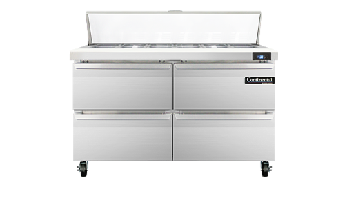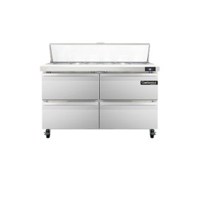 Sandwich Unit, 48" wide, two-section, (12) 1/6 size x 4" deep pans with 12" cutting board, (4) drawers, accommodates (1) 12 x 18 x 6 pan per drawer or (1) 1/2 x 6 pan & (1) 1/3 x 6 pans per drawer capacity (supplied by others), stainless steel top, front and end panels, aluminum interior, 5" casters, rear mounted self-contained refrigeration, 1/5 hp