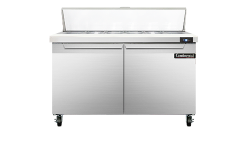 Sandwich Unit, 48" wide, two-section, (12) 1/6 size x 4" deep pans with 12" cutting board, (2) field rehingable doors, stainless steel top, front and end panels, aluminum interior, 5" casters, rear mounted self-contained refrigeration, 1/5 hp