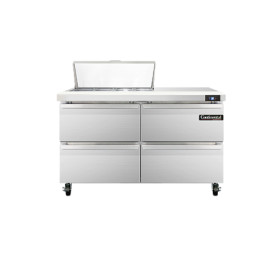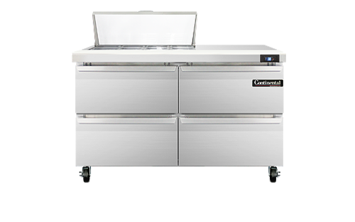 Sandwich Unit, 48" wide, two-section, (8) 1/6 size x 4" deep pans with 12" cutting board, (4) drawers accommodates (1) 12 x 18 x 6 pan per drawer or (1) 1/2 x 6 pan & (1) 1/3 x 6 pans per drawer capacity (supplied by others), stainless steel top, front and end panels, aluminum interior, 5" casters, rear mounted self-contained refrigeration, 1/5 hp