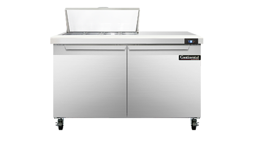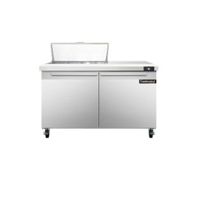 Sandwich Unit, 48" wide, two-section, (8) 1/6 size x 4" deep pans with 12" cutting board, (2) field rehingable doors, stainless steel top, front and end panels, aluminum interior, 5" casters, rear mounted self-contained refrigeration, 1/5 hp
