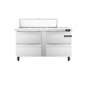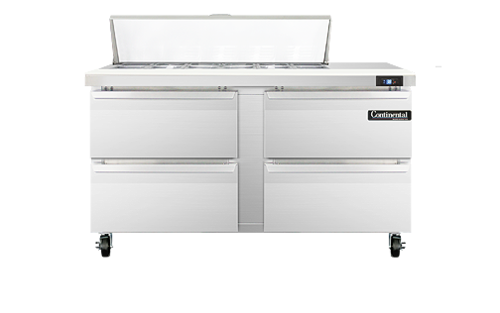 Sandwich Unit, 60" wide, two-section, (12) 1/6 size x 4" deep pans with 12" cutting board, (4) drawers, accommodates (1) 12 x 20 x 6 pan per drawer (supplied by others), stainless steel top, front and end panels, aluminum interior, 5" casters, rear mounted self-contained refrigeration, 1/4 hp