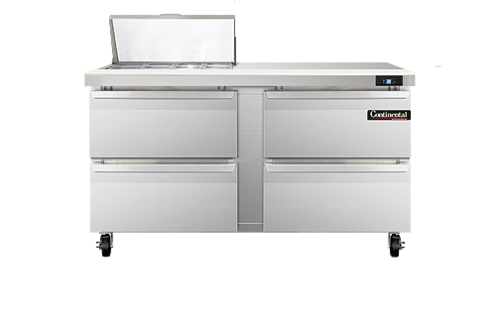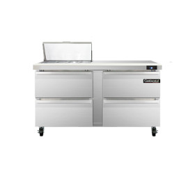 Sandwich Unit, 60" wide, two-section, (8) 1/6 size x 4" deep pans with 12" cutting board, (4) drawers, accommodates (1) 12 x 20 x 6 pan per drawer (supplied by others), stainless steel top, front and end panels, aluminum interior, 5" casters, rear mounted self-contained refrigeration, 1/4 hp