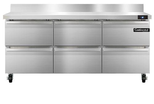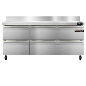 Work Top Refrigerator, 72" wide, three-section, stainless steel top with 5 1/2" backsplash, (6) drawers, accommodates (1) 12 x 18 x 6 pan per drawer or (1) 1/2 x 6 & (1) 1/3 x 6 pans per drawer (supplied by others), stainless steel front and end panels, aluminum interior, 5" casters, rear mounted self-contained refrigeration, 1/4 hp