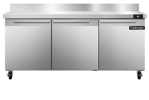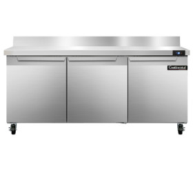 Work Top Refrigerator, 72" wide, three-section, stainless steel top with 5 1/2" backsplash, (3) field rehingable doors, stainless steel front and end panels, aluminum interior, 5" casters, rear mounted self-contained refrigeration, 1/4 hp