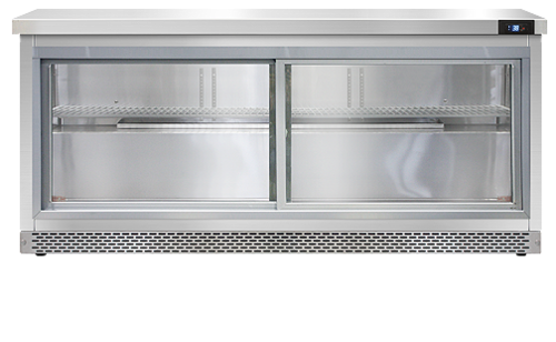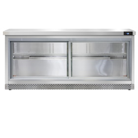 Work Top Display Refrigerator, Front Breather, 72" wide, three-section, (2) sliding glass doors, LED interior lighting, stainless steel front and end panels, aluminum interior, 3-5/8" casters, rear mounted self-contained refrigeration, 1/3 hp