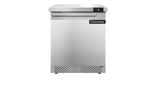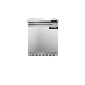 Work Top Freezer, Front Breather, 27" wide, one-section, stainless steel flat top, (1) field rehingable door, stainless steel front and end panels, aluminum interior, 3-5/8" casters, rear mounted self-contained refrigeration, 1/3 hp