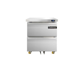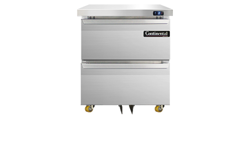 Undercounter Freezer, 48" wide, two-section, accommodates (1) 12 x 18 x 6 pan per drawer or (1) 1/2 x 6 pan & (1) 1/3 x 6 pans per drawer capacity (supplied by others), stainless steel front, top and end panels, aluminum interior, 1 3/8" diameter plate casters, front breathing, electronic controller w/ digital display, rear-mounted self-contained refrigeration, 1/4 hp