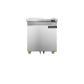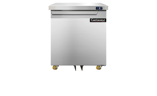 Undercounter Freezer, 48" wide, two-section, (2) field rehingable door, stainless steel front, top and end panels, aluminum interior, 1 3/8" diameter plate casters, front breathing, electronic controller w/ digital display, rear-mounted self-contained refrigeration, 1/4 hp