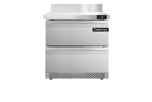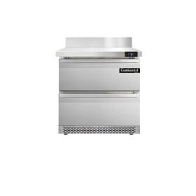 Work Top Freezer, Front Breather, 32" wide, one-section, stainless steel top with 5 1/2" backsplash, (2) drawers, accommodates (1) 12 x 20 x 6 pan per drawer or (1) 1/2 x 6 pan & (2) 1/3 x 6 pans per drawer capacity (supplied by others), stainless steel front and end panels, aluminum interior, 3-5/8" casters, rear mounted self-contained refrigeration, 1/3 hp