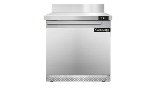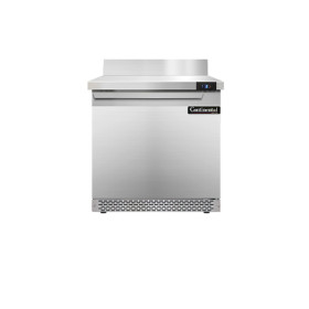 Work Top Freezer, Front Breather, 32" wide, one-section, stainless steel top with 5 1/2" backsplash, (1) field rehingable door, stainless steel front and end panels, aluminum interior, 3-5/8" casters, rear mounted self-contained refrigeration, 1/3 hp
