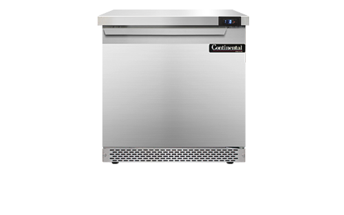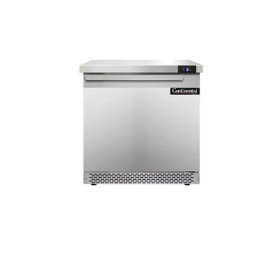 Work Top Freezer, Front Breather, 32" wide, one-section, stainless steel flat top, (1) field rehingable door, stainless steel front and end panels, aluminum interior, 3-5/8" casters, rear mounted self-contained refrigeration, 1/3 hp