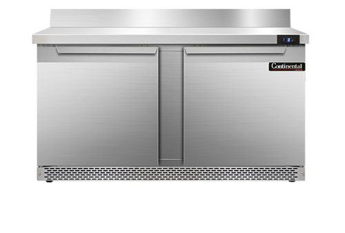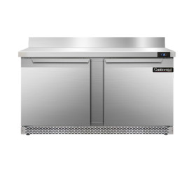 Work Top Freezer, Front Breather, 60" wide, two-section, stainless steel top with 5 1/2" backsplash, (2) field rehingable doors, stainless steel front and end panels, aluminum interior, 3-5/8" casters, rear mounted self-contained refrigeration, 1/2 hp