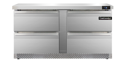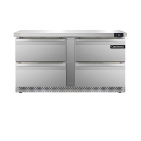 Work Top Freezer, Front Breather, 60" wide, two-section, stainless steel flat top, (4) drawers, accommodates (1) 12 x 20 x 6 pan per drawer (supplied by others), stainless steel front and end panels, aluminum interior, 3-5/8" casters, rear mounted self-contained refrigeration, 1/2 hp