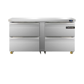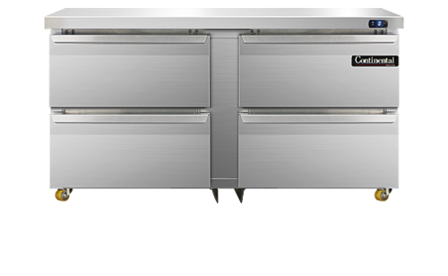 Undercounter Freezer, 60" wide, two-section, accommodates (1) 12 x 20 x 6 pan per drawer (supplied by others), stainless steel front, top and end panels, aluminum interior, 1 3/8" diameter plate casters, front breathing, electronic controller w/ digital display, rear-mounted self-contained refrigeration, 1/2 hp
