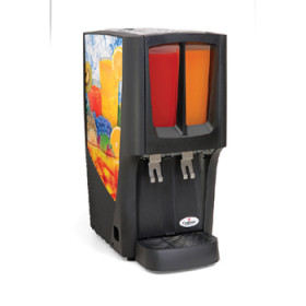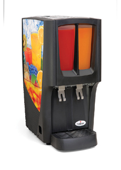 This double bowl premix cold beverage dispenser is made of black plastic with alluring graphics on each side so that your beverage will draw interest from every angle! It features a patented Tri-Cool evaporator with a large 3 sided cooling surface that will refrigerate the 2.4 gallon bowls to keep drinks crisp and delicious at your snack bar, buffet, convenience store, or fast food restaurant.