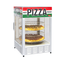Constructed of stainless steel inside and out, our cabinets and ovens are designed for years of durability and easy maintenance. The display cabinet heat ranges between 135 and 170 degrees. Our rotating, heavy gauge wire shelving rack holds four pizzas (up to 16") at a time. The rack slowly turns inside the cabinet and automatically stops when the door is opened. An easy to access water tray provides the perfect humidity in the cabinet to keep pizza from drying out. Internal lights merchandise your cooked pizzas.