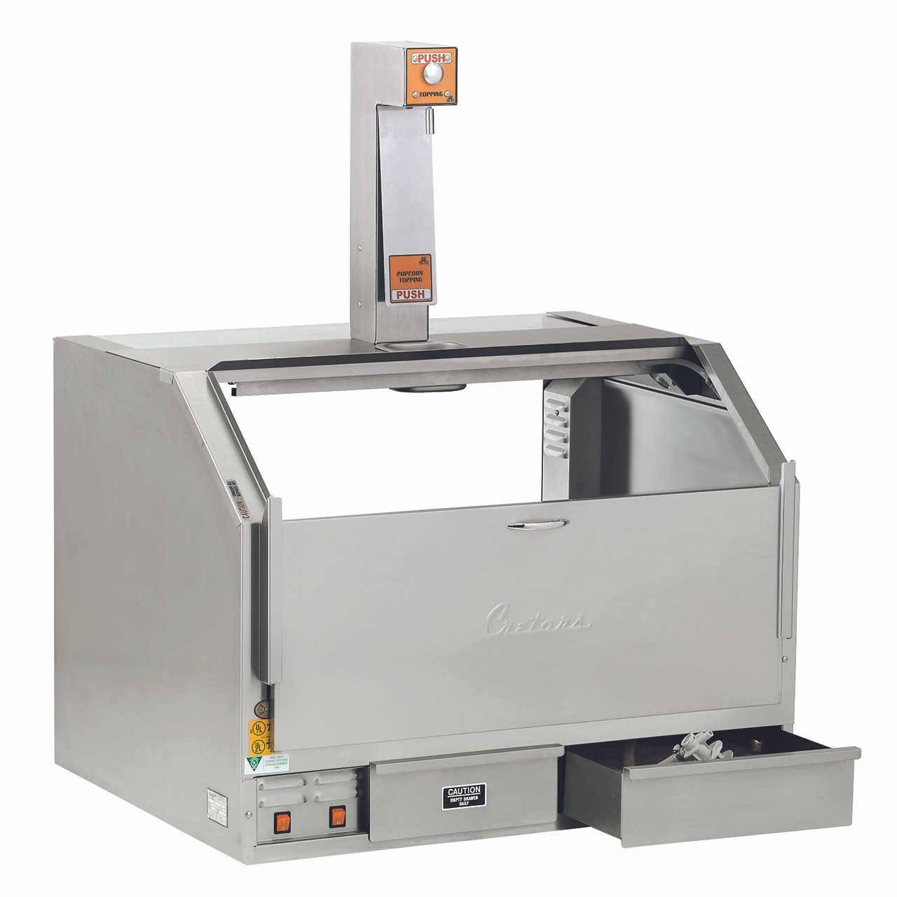 Heat created by the Cornditioner cabinet helps to keep topping warm and ready for serving. The pullout drawer is built into the bottom of the cabinet for topping bag installation. The oil line is heated from the bag connection to the output where the topping is dispensed. The 36" Cornditioner Popcorn Cabinet is constructed of durable stainless steel that is easy to wipe down and keep clean.