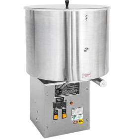 Our original two mixing baffle design improve the coating process and efficiency, providing a well coated product without having to use your hands to help mix. An aluminum heat plate is used for optimal heat control while eliminating hot spots. An adjustable digital display and control is designed for precise temperature settings and measures actual product temperature. An audible alarm indicates when temperature is reached. Stainless steel mixing bowl, agitator blade and pedestal make it durable and easy to clean. No need to remove pieces that will get lost or broken, just add water to the kettle, put the lid on and steam it clean! What a labor saver! The CMD 50 can be purchased as a component or combined with a Cretors pedestal popper and frame with stainless steel receiving tray or table to create a small caramel corn popping plant. Left hand operation.