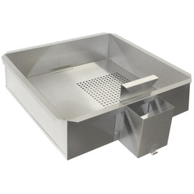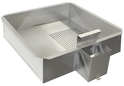 This stainless-steel bin with lift-up scrap screen completes the Double Feature popping and coating system. Designed for use on a countertop, the bin combined with the Double Feature popper and coater provides small batch caramel corn production virtually anywhere with no assembly required. The optional corn chute with a removable sliding divider is designed to manually push fresh caramel corn through the chute into a bulk storage container located beside the counter or table. Can also be used with Poppi.