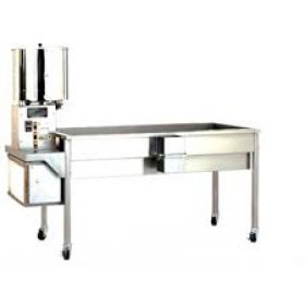 Our original two mixing baffle design improve the coating process and efficiency, providing a well coated product. An aluminum heat plate is used for optimal heat control while eliminating hot spots. An adjustable digital display and control is designed for precise temperature settings and measures actual product temperature. An audible alarm indicates when temperature is reached. Stainless steel mixing bowl, agitator blade and pedestal make it durable and easy to clean. The CMD 50 can be purchased as a component or combined with a Cretors Pedestal popper and frame with stainless steel receiving tray or table to create a small caramel corn popping plant. Optional custom built cooling bin has optional built in blowers that blow cool air up through the perforated steel tray bottom, cooling the coated corn more rapidly and speeding up the production process. Shown with Left Hand Dump this one comes with a Right Hand Dump.
