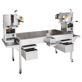 - Built-in pump caddy shelf beneath popper allows the pump to move with the table to reduce oil spillage and broken hoses