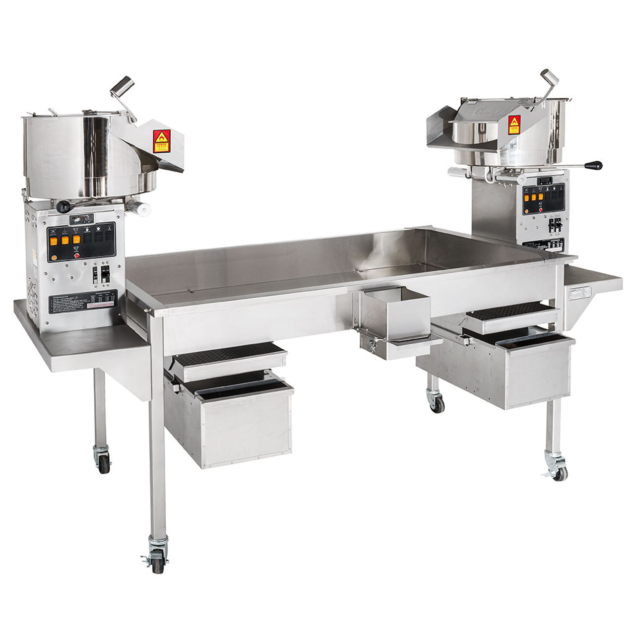 If high volume backroom production is what you need, simply install two pedestal kettles onto one of our knockdown tables. Expand your product line to include savory, as well as candy and caramel-coated popcorn. It's not just how much corn you pop, it's how well you pop it. That's the philosophy behind our high-volume Giant Poppers, which let you pop anywhere from a small amount to a mountain of popcorn. These Cretors poppers are designed as compatible components in your production system. Designed to operate efficiently behind the scenes or up front, they're ideal for theaters, shopping malls, stadiums and arenas.