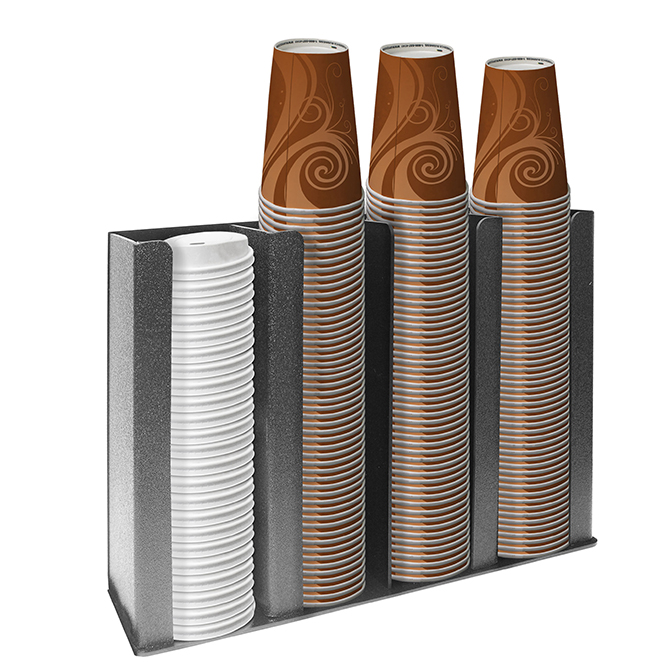 This dispenser from Holiday House is simple and compact. At only 4.5" wide it takes up very little counter space to dispense four sections of cups and lids. Because of its open style and clear construction the contents are easy to see from any angle. Made of easy to clean "Lexan“ break-resistant plastic.