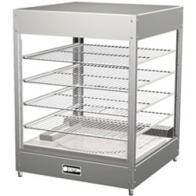 Perfect for concession stands, the Doyon DRP4 pizza warmer's four shelves can hold pizzas, hot dogs, chickens, and other customer favorites. Temperatures in the cabinet can be adjusted up to 175 degrees Fahrenheit. Staff members can monitor the temperature on a legible thermometer. To keep food inside the warmer fresh and moist, there is an internal water pan that creates humidity.