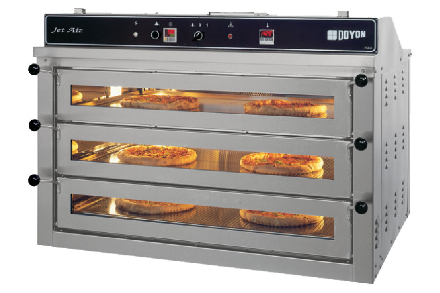 Doyon's PIZ series are the most advanced and productive compact pizza ovens on the market. The unique Jet Air sytems helps you bake 30% to 50% faster and more evenly than traditional deck ovens. These exclusive ovens occupy 40% to 50% less floor space for the same production. Preheats in 15 to 20 minutes or less at the start of the day and will bake your pizzas in 5 to 6 minutes at 460° F (238° C). The heat provided from the nickel coated perforated deck makes a nice even crust thanks to the air moving through the holes and from the heat of the metal deck itself. You can remove a product and put another one at the same place without concern about cold spots you get from traditional deck ovens. Reduce your energy costs by more than 50% compared to a deck oven.The air is recycled and the heating system will be on about 60% of the time because of it's high efficiency. The PIZ series is priced at half the price of conveyor ovens. It takes less floor space, offers greater menu flexibility and higher quality baking results. The PIZ series is priced a little higher then traditional deck ovens but it makes up the difference in increased production, better performance, energy and labor savings