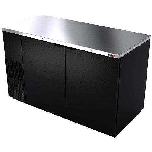 Backbar Cooler, (2) solid doors, (852) 12 oz cans or (2) keg capacity, (4) epoxy coated flat shelves, (2) epoxy coated bottle rails, 18 ga. s/s top, black exterior finish, galvanized interior, s/s floor, doors w/locks, fluorescent interior light, self-contained refrigeration, 1/3 hp, cETL, UL, NSF-7