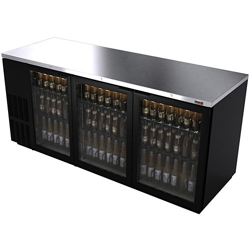 Backbar Cooler, (3) glass doors with black frame, (1092) 12oz. cans or (4) keg capacity, (6) flat shelves, analog thermostat, fluorescent interior light, doors w/locks, stainless steel floor, black exterior finish, self contained refrigeration, 1/3 hp, cETL, UL, NSF-7