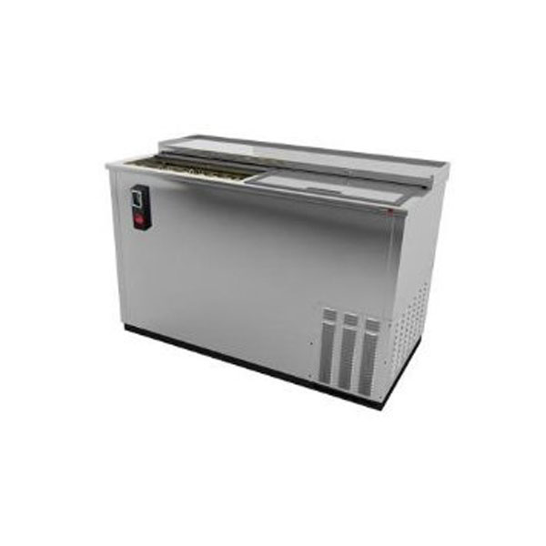 Bottle Cooler, 50" wide, deep well horizontal, 37 cu. ft., 23.3 cases (12 oz. bottles) capacity, (2) lids, (3) epoxy coated bin dividers, locks per lid, analog thermostat, incandescent interior light, cap catcher, galvanized interior, stainless steel top with raised glass rails, stainless steel front, sides & back, side mounted self-contained refrigeration, 1/3 hp, cETL, UL, NSF-7