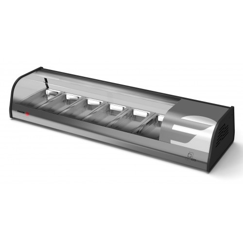 55" Sushi Case Display Refrigerator, 55"W x 15.75"D x 9-7/8"H, 115 Volt, 4.2 Amps, 1/5 HP compressor, stainless steel construction with anodized aluminum side panel, longer, and maintain optimal temperature at 36 to 46 degrees, front curve glass design.