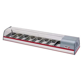 Tapas Case, (8) 1/3 GN pan capacity (1.5" deep), front curved glass, (2) service side glass sliding doors, incandescent light, right side mounted compressor, s/s construction, 1/5 hp, 115v/60/1-ph, 4.2 amps, cETL, UL, NSF-7
