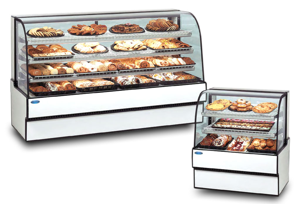 Curved thermopane tilt-front glass, top light and lighted shelves, three tiers of adjustable white wire shelves, glass sliding rear doors, white interior, tempered glass ends, choice of laminate with black trim, designed for continuous lineups, UL safety and UL sanitation approved