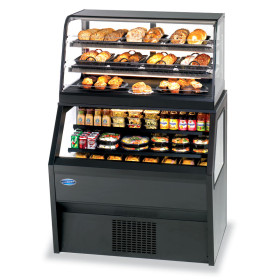 Refrigerated Self-Serve Bottom: black laminated exterior with black trim, horizontal top and front light, two tiers of black metal shelves with black interior, tempered glass ends, Hot Self-Serve Top: three hinged lift-up doors, black trim, top light with lighted shelves, adjustable stainless steel heated shelves, sliding rear doors, UL safety and UL sanitation approved, 1/3 HP