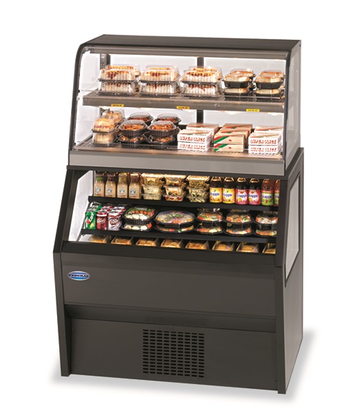 Refrigerated Self-Serve Bottom: black laminated exterior with black trim, horizontal top and front light, two tiers of black metal shelves with black interior, tempered glass ends, Hot top: front glass with black trim, top light with lighted shelves, stainless steal deck with humidified air system, adjustable stainless steel heated shelves, sliding rear doors, UL safety and UL sanitation approved, 1/2 HP