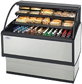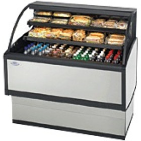 Self contained refrigeration with condensate evaporator, adjustable temperature control, energy saving night curtain, horizontal top light, two tiers of solid black metal shelves, stainless steel display deck and black interior, black trim, tempered glass ends, cord and plug, choice of laminate, 120v/60hz/1ph electrical, UL safety and UL sanitation approved, 1/3 HP
