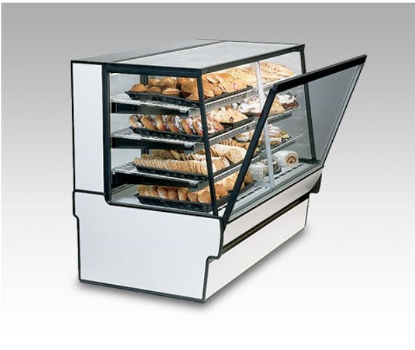 Sloped thermopane tilt-front glass, top light and lighted shelves, two tiers of adjustable white wire shelves, glass sliding rear doors, white interior, tempered glass ends, choice of laminate with black trim, designed for continuous lineups, UL safety and UL sanitation approved