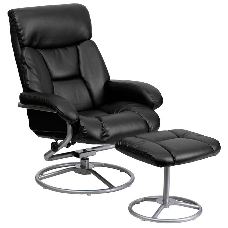 - This overstuffed leather recliner will look great in any room in the home or office. This set features plush padding throughout the chair and ottoman as well as exposed metal bases. The durable leather upholstery allows for easy cleaning and regular care.