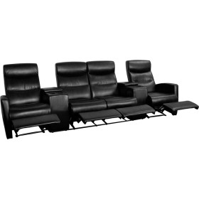 - Complete your theater room with this comfortable theater style seating. The soft leather will keep you comfortable as you sit down with friends and family for movie night or while playing video games. The convenience of two storage consoles is perfect for holding beverages and storing small items.