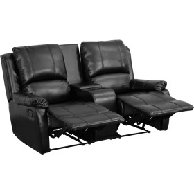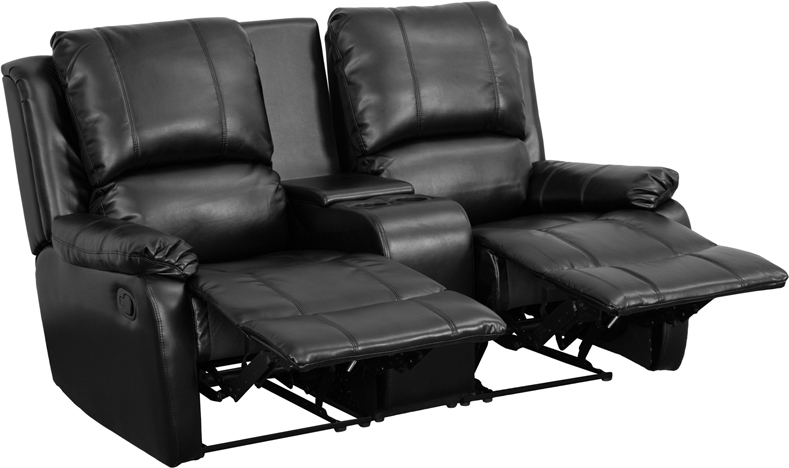 - Complete your theater room with this comfortable theater style seating. Reclining furniture offers the best in relaxation for you to kick up your feet to watch TV, work on a laptop, or to just hang out with family and friends. This theater set features a plush back and a storage compartment with cup holders. The flip-up armrests contain plenty of room for storing remotes, magazines, and game controllers. The soft leather will keep you comfortable as you sit down with friends and family for movie night or while playing video games. You can setup as many rows as needed to fill up your desired space.