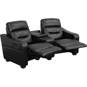 - Complete your theater room with this comfortable theater style seating. Reclining furniture offers the best in relaxation for you to kick up your feet to watch TV, work on a laptop, or to just hang out with family and friends. This theater set features a plush back, a cup holder wedge with a deep storage compartment and naturally slanted armrests. The flip-up armrests contain plenty of room for storing remotes, magazines, and game controllers. The curved setup will add an appealing look to your room. You can setup as many rows as needed to fill up your desired space.