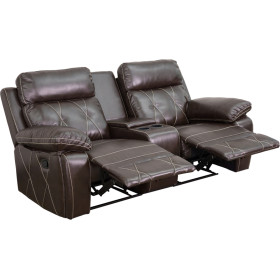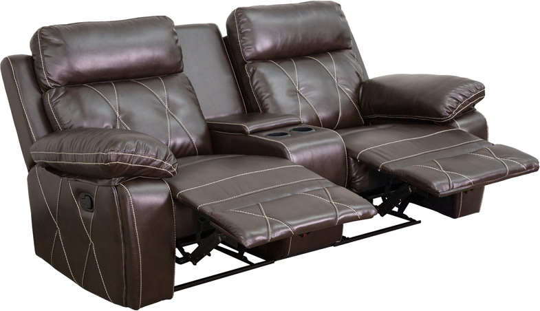- Complete your theater room with this comfortable theater style seating. Reclining furniture offers the best in relaxation for you to kick up your feet to watch TV, work on a laptop, or to just hang out with family and friends. This theater set features elegantly styled stitching throughout and plush upholstered arms. The cup holder wedge has a deep storage compartment to keep up with your remotes and magazines. You can setup as many rows as needed to fill up your desired space.