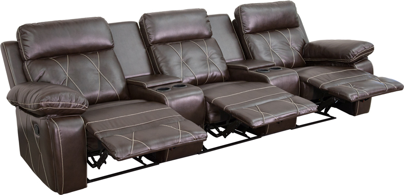 - Complete your theater room with this comfortable theater style seating. Reclining furniture offers the best in relaxation for you to kick up your feet to watch TV, work on a laptop, or to just hang out with family and friends. This theater set features elegantly styled stitching throughout and plush upholstered arms. The cup holder wedge has a deep storage compartment to keep up with your remotes and magazines. The middle seat reclines with a quick pull on the handle. You can setup as many rows as needed to fill up your desired space.