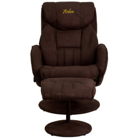 Recline in your favorite position with this comfortable recliner and ottoman set. This set features a built-in pillow top headrest, padded arms and microfiber wrapped bases. This set is not only perfect in the home, but makes for a great addition in the office when you need to relax for a bit. Personalize this chair with custom text to show off your individual style.