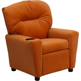 - The child-sized recliner with plush padding is a perfect spot for kids to watch TV, play video games or read their favorite book.The chair features soft and snuggly microfiber upholstery and a built in cup holder to free up busy hands and prevent spills. This sturdy little recliner has a solid hardwood frame, soft foam padding and durable upholstery that cleans easily with a damp cloth. It has raised black plastic feet and will hold up to 90 pounds. Designed with safety in mind, it's filled with CA117 fire retardant foam, and reclines only when a child is seated and the footrest is pulled out one inch.This cozy kids recliner will be a great addition to your living room or your child's bedroom or playroom.