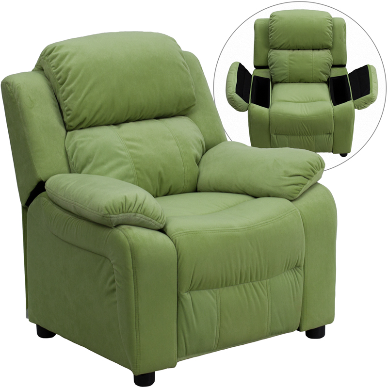 - The child-sized recliner with deluxe padding is a perfect spot for kids to watch TV, play video games or read their favorite book.It's covered with soft and snuggly microfiber upholstery and features flip-up storage arms for remote controls, books and game controllers. This sturdy little recliner has a solid hardwood frame, soft foam padding and durable upholstery that cleans easily with a damp cloth. It has raised black plastic feet, and will hold up to 90 pounds. Designed with safety in mind, it's filled with CA117 fire retardant foam, and reclines only when a child is seated and the footrest is pulled out one inch.This cozy kids recliner will be a welcome addition to your living room or your child's bedroom or playroom.