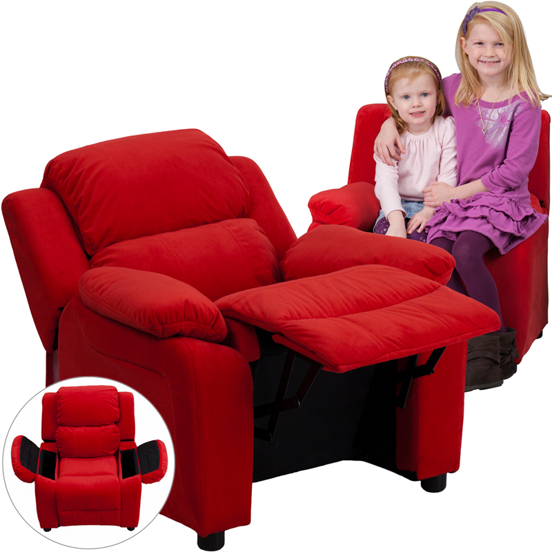- The child-sized recliner with deluxe padding is a perfect spot for kids to watch TV, play video games or read their favorite book.It's covered with soft and snuggly microfiber upholstery and features flip-up storage arms for remote controls, books and game controllers. This sturdy little recliner has a solid hardwood frame, soft foam padding and durable upholstery that cleans easily with a damp cloth. It has raised black plastic feet, and will hold up to 90 pounds. Designed with safety in mind, it's filled with CA117 fire retardant foam, and reclines only when a child is seated and the footrest is pulled out one inch.This cozy kids recliner will be a welcome addition to your living room or your child's bedroom or playroom.