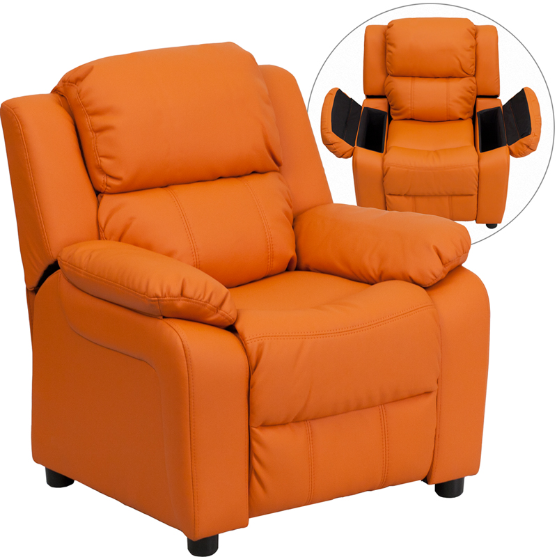 - The child-sized recliner with deluxe padding is a perfect spot for kids to watch TV, play video games or read their favorite book.The chair features plush padding, vinyl upholstery and flip-up storage arms for remote controls, books and game controllers. This sturdy little recliner has a solid hardwood frame and durable upholstery that cleans easily with a damp cloth. It has raised black plastic feet and will hold up to 90 pounds. Designed with safety in mind, it's filled with CA117 Fire retardant foam, and reclines only when a child is seated and the footrest is pulled out one inch.This cozy kids recliner will be a great addition to your living room or your child's bedroom or playroom.